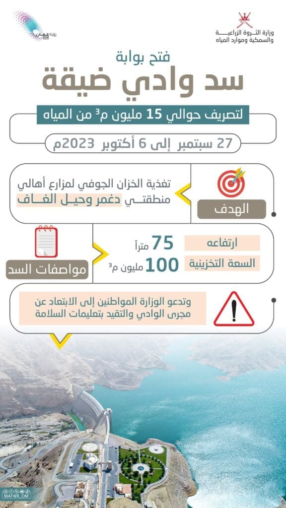 بلادنا عام فتح بوابة سد وادي ضيقة.. ودعوة المواطنين إلى الابتعاد عن مجرى الوادي سنتين ago أعلنت وزارة الثروة الزراعية والسمكية وموارد المياه عن فتح بوابة سد وادي ضيقة لتصريف حوالي 15 مليون م³ من المياه خلال الفترة 27 سبتمبر إلى 6 أكتوبر 2023م Post navigation Previous آمرُ كلية الدفاع الوطني يستقبل كبير مستشاري الأبحاث بمعهد جاكا أوغاتا ساداكو اليابانيNext مجموعة بن حم تبحث فرصاً استثمارية في سلطنة عمان