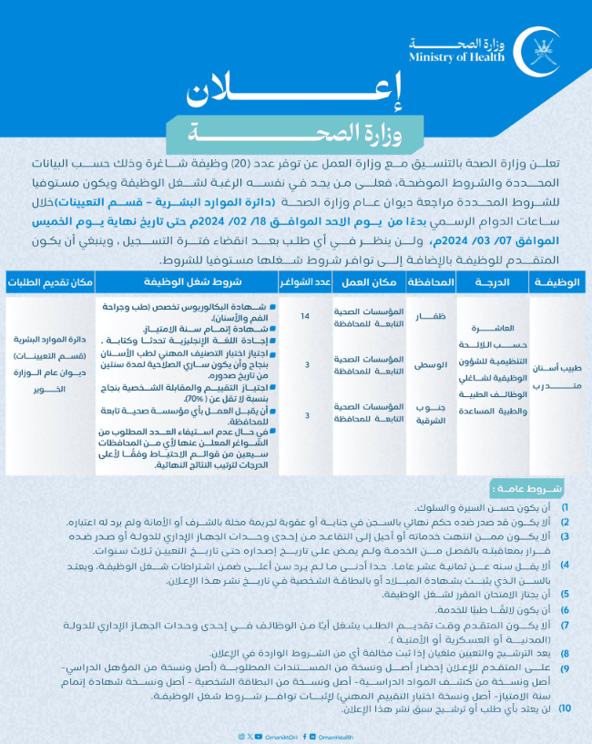 أعلنت وزارة الصحة بالتعاون مع وزارة العمل عن توفر عدد (20) وظيفة شاغرة لشغل وظيفة (طبيب أسنان متدرب)، مـن يجـد فـي نفسـه الرغبـة لشـغل الوظيفة ويكون مسـتوفيا للشروط المحددة مراجعة ديوان عام الوزارة خلال الفترة المحددة أدناه.