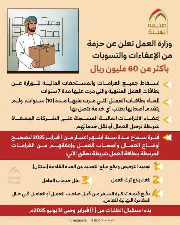 في إطار الجهود المستمرة لتصحيح أوضاع القوى العاملة وتعزيز ضمان حقوق الأفراد وأصحاب الأعمال بالشكل الذي يسهم إيجابا في تنظيم سوق العمل ، وبناء على موافقة مجلس الوزراء الموقر تعلن وزارة العمل عن حزمة من الإعفاءات والتسويات المالية بقيمة إجمالية تجاوزت 60 مليون ريال عماني وذلك على النحو الآتي :