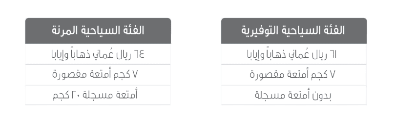 كما توفر رحلات الطيران العماني مجموعة متنوعة من الجداول الزمنية وخيارات السفر على فئة (السياحية القيّمة ) وبسعر ۸۷ ريال عُماني ( ۳۰ ) كيلو أمتعة مسجلة) وتوفر أيضاً خيارات واسعة على درجة رجال الأعمال، مما يمنح الضيوف المسافرين مزيدا من المرونة في التخطيط لرحلاتهم والاستفادة من مزايا إضافية تشمل الوزن الإضافي. وقد لوحظ تداول أسعار درجة رجال الأعمال المتوفرة على بعض الرحلات على أنها أسعار الدرجة السياحية، وبالأخص عندما تكون مقاعد الدرجة السياحية محجوزة بالكامل.