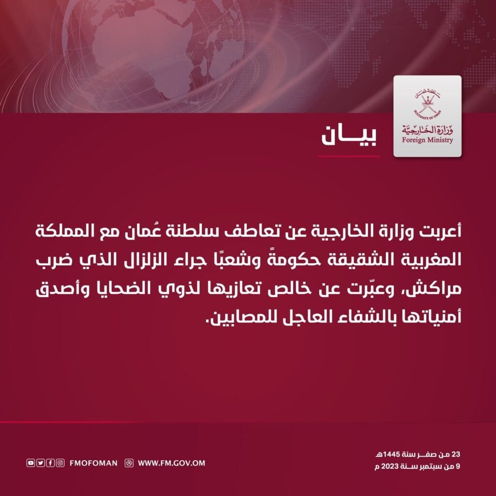 سلطنة عُمان تعرب عن تعازيها للمملكة المغربية الشقيقة