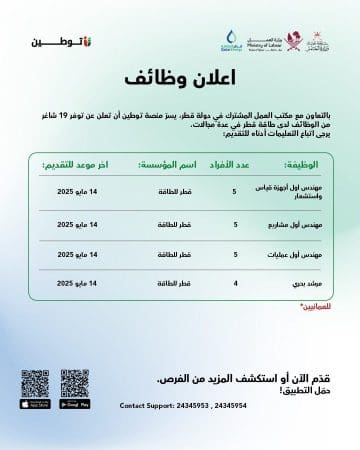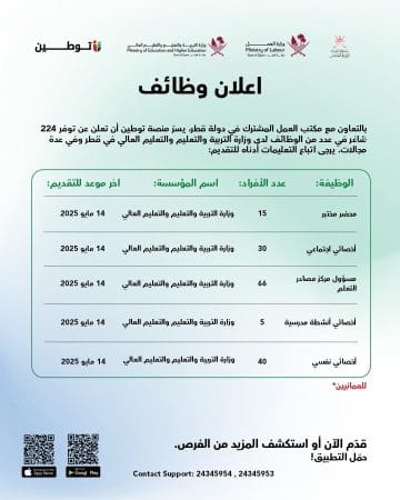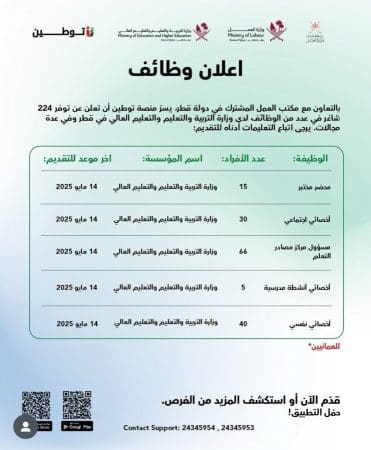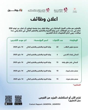 بلادنا وظائف شاغرة للعمانيين في دولة قطر 9 أشهر منذ مسقط – السبلة أعلنت منصة “توطين” بالتعاون مع مكتب العمل المشترك في دولة قطر، عن توفير 224 وظيفة شاغرة للعمانيين لدى وزارة التربية والتعليم والتعليم العالي في دولة قطر وفي عدة مجالات. Tags: عمان قطر تنقل المقالة السابق وظائف شاغرة بهيئة الخدمات الماليةالتالي قرار عاجل من وزارة العمل بشأن تعيين عماني في الشركات التي أكملت عاماً من تاريخ تأسيسها