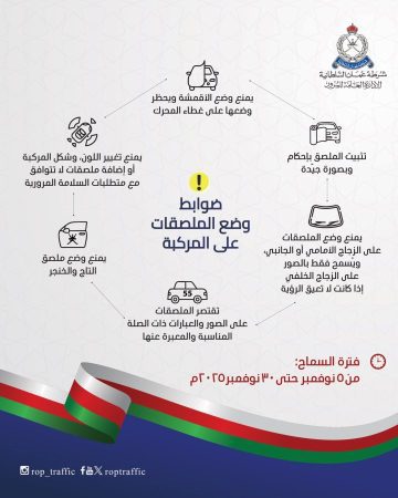 بلادنا ضوابط وضع الملصقات على المركبات بمناسبة اليوم الوطني العُماني 3 ساعات ago مسقط – السبلة أصدرت الإدارة العامة للمرور ضوابط وضع الملصقات على المركبات بمناسبة اليوم الوطني العُماني، خلال الفترة من 5 إلى 30 نوفمبر الجاري. Tags: اليوم الوطني العُماني Post navigation Previous وزارة العمل تطرح 1152 وظيفة حكومية
