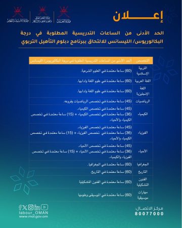 أعلنت وزارة العمل بالتنسيق مع وزارة التربية والتعليم ووزارة التعليم العالي والبحث العلمي والابتكار والجامعات المعتمدة عن توفر عدد من الفرص التدريبية للحصول على دبلوم التأهيل التربوي” ، وذلك بهدف إعدادهم للتنافس لاحقاً على شغل وظيفة “معلم” بوزارة التربية والتعليم.
