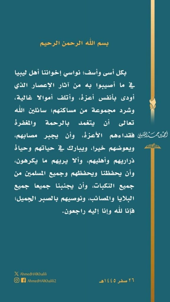 نشر الحساب الرسمي لسماحة الشيخ أحمد بن حمد الخليلي المفتي العام لسلطنة عُمان تغريدةً جاء فيها: “بكل أسى وأسف؛ نواسي إخواننا أهل ليبيا في ما أصيبوا به من آثار الإعصار؛ سائلين الله تعالى أن يجبر مصابهم، ويعوضهم خيرا. نوصيهم بالصبر الجميل؛ فإنا لله وإنا إليه راجعون”.