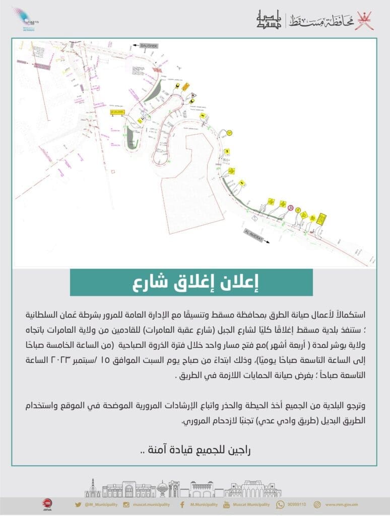 بلادنا عام إغلاق طريق (عقبة العامرات) لمدة 4 أشهر سنتين ago أعلنت بلدية مسقط عن غلق طريق الجبل كليًا (شارع عقبة العامرات) للقادمين من العامرات باتجاه ولاية بوشر لمدة أربعة أشهر ابتداءً من يوم السبت 16/سبتمبر/2023، مع فتح مسار واحد خلال فترة الذروة الصباحية (5-9 صباحًا) ؛ بغرض أعمال الصيانة اللازمة . Post navigation Previous محمد الغساني رئيس مجلس ادارة بنك التنمية لن يدخل شاب عُماني السجن بسبب عدم وفاء الدين إذا كان مجتهد في إدارة مشروعه، وأنا مسؤول عن هذا الكلام. | المصدر : هلا اف امNext عُمان تترأس اجتماع وكلاء وزارات الأوقاف بدول الخليج