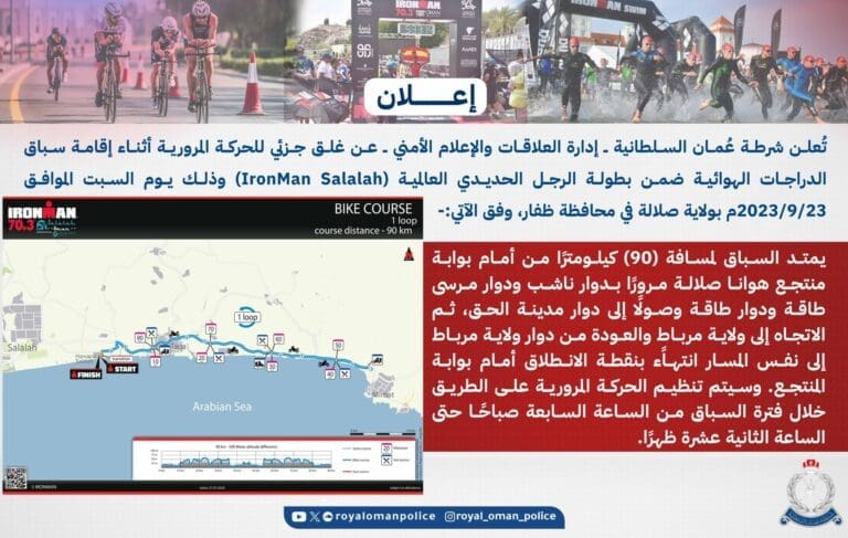 قالت شرطة عمان السلطانية إنه بمناسبة إقامة بطولة الرجل الحديدي العالمية (IronMan Salalah) التي ستقام…